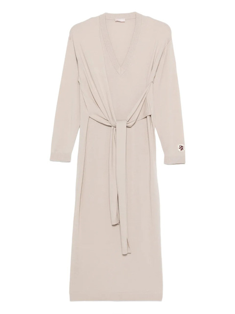 beige V-neck long sleeves self-tie belt side slits straight hem