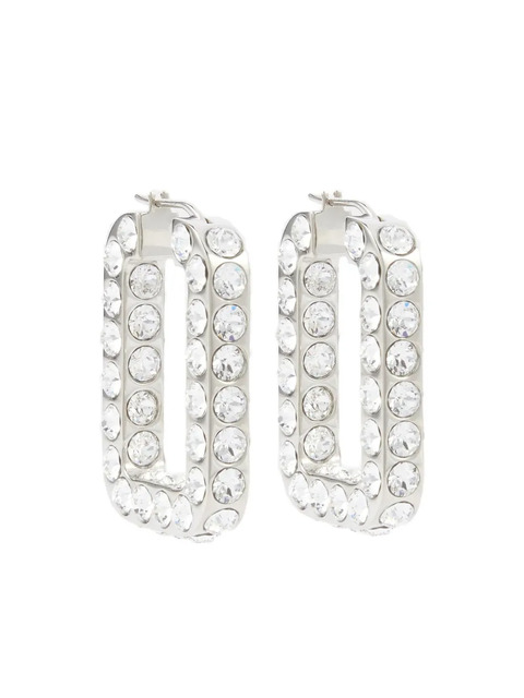 silver rectangular shape crystal embellishment hoop design engraved logo These earrings come as a pair.