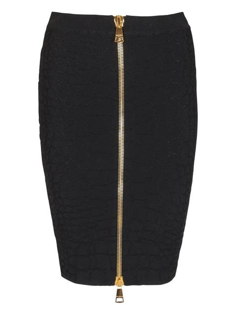 black crocodile-effect knit gold-tone zip fastening body hugging knee length straight hem