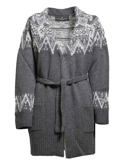 grey cashmere blend fairisle pattern belted waist long sleeves ribbed cuffs and hem