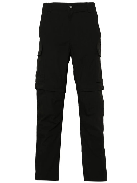 black cotton blend ripstop texture logo patch to the front embroidered logo to the rear belt loops two diagonal pockets to the sides two side flap pockets tapered leg front button and zip fastening