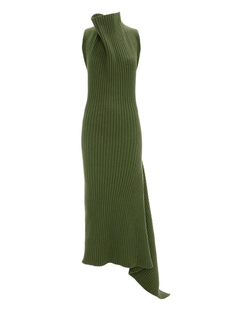 green ribbed knit high neck sleeveless asymmetrical hem draped detailing