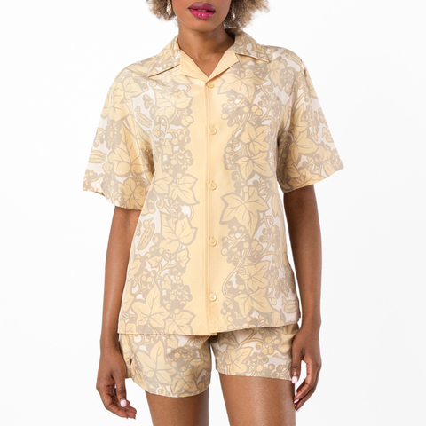 Burberry Ladies Tops. Fashion category: Shirts & Blouses. SKU: 8092509. Color: Flax Ip Pattern. Burberry Ivy Print Silk Pyjama Shirt. Crafted from Italian-woven silk poplin, this pyjama shirt features seasonal ivy and duck motifs throughout. Designed for a relaxed fit, it is styled with a revere collar, short sleeves, and a chest patch pocket. The look is completed with a button-front closure and a straight hem. 100% Silk. Made in Italy.