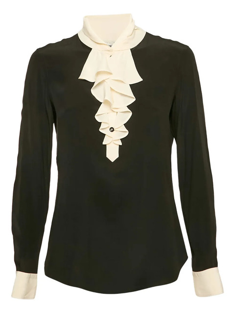 black silk high neck detail ruffle embellishment long sleeves button closure at front Condition: GOOD. This previously owned and used item is in good condition with minimal signs of use. This may include fading of material or plating and scratches.