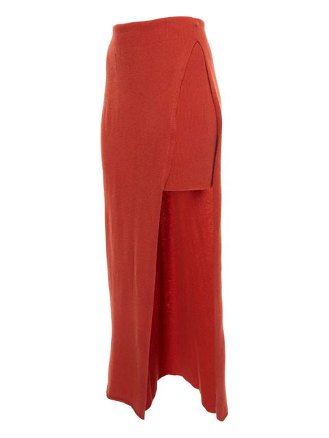 red wool cashmere blend high-low hemline asymmetrical split ribbed panel detail straight waistband Condition: GOOD. This previously owned and used item is in good condition with minimal signs of use. This may include fading of material or plating and scratches.