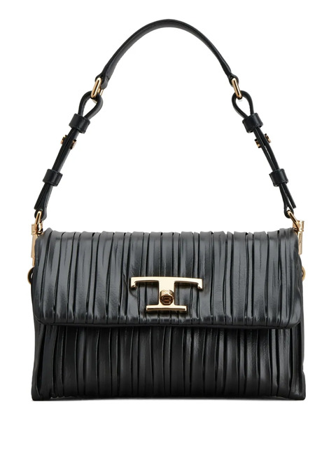 black pleated leather T-clasp fastening top handle adjustable detachable shoulder strap gold-tone hardware