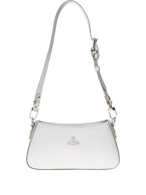 silver pebbled texture adjustable detachable shoulder strap top zip fastening orb emblem curved silhouette