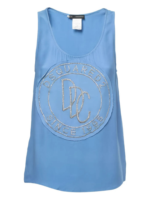 blue beaded logo frayed edges sleeveless round neckline Condition: GOOD. This previously owned and used item is in good condition with minimal signs of use. This may include fading of material or plating and scratches.