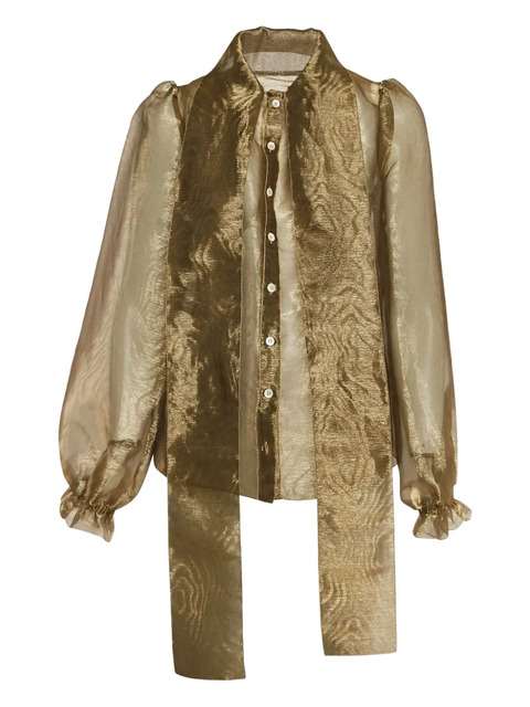 gold-tone metallic finish sheer finish button front long sleeves ribbon tie detail Condition: EXCELLENT. This previously owned item is in near-perfect condition with no signs of damage or use.
