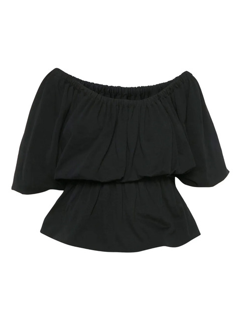 black cotton elasticated details off-shoulder neckline gathered design short sleeves Condition: GOOD. This previously owned and used item is in good condition with minimal signs of use. This may include fading of material or plating and scratches.