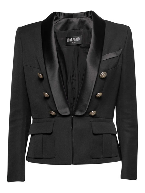 black wool button embellishment structured shoulders satin lapel detail double breasted closure Condition: EXCELLENT. This previously owned item is in near-perfect condition with no signs of damage or use.