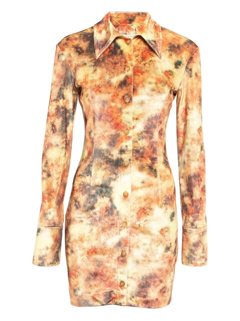 orange brown all-over print long sleeves button front collared neck Condition: UNWORN. This item is previously owned but remains unworn and in its original condition. However, it does not come with its original tags.