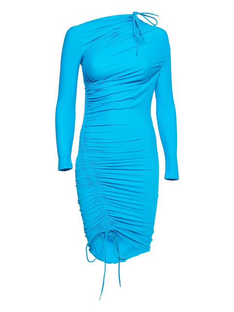 blue long sleeves ruched detailing asymmetrical neckline drawstring hem Condition: GOOD. This previously owned and used item is in good condition with minimal signs of use. This may include fading of material or plating and scratches.