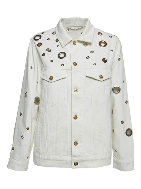 white denim metallic grommets eyelet detailing gold buttons cut-out design Condition: GOOD. This previously owned and used item is in good condition with minimal signs of use. This may include fading of material or plating and scratches.