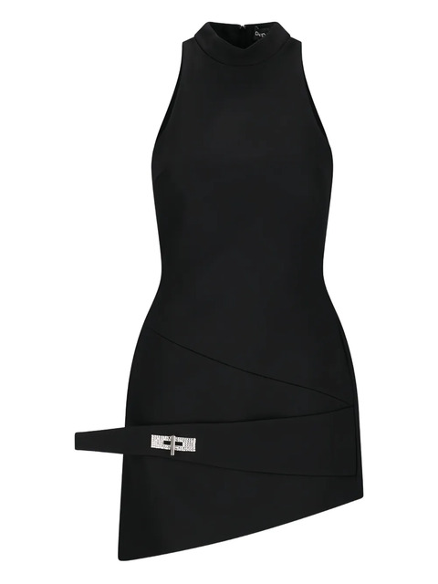 black asymmetric hem halter neck mini length buckle detail zip fastening