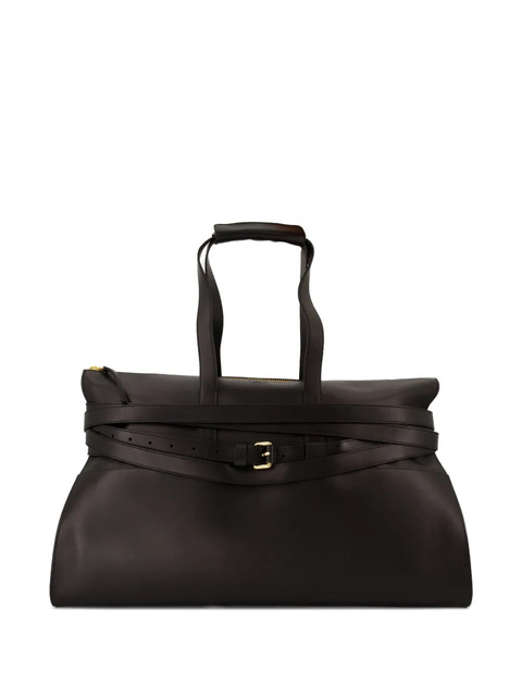 black leather embossed logo top zip fastening fixed handles detachable belt