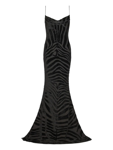 black zebra print cowl neck spaghetti straps velvet texture concealed zip fastening