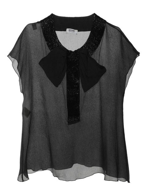 black silk bow detail beaded neckline semi-sheer construction short sleeves Condition: GOOD. This previously owned and used item is in good condition with minimal signs of use. This may include fading of material or plating and scratches.