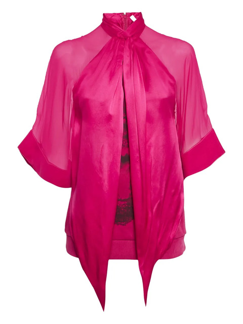 pink satin overlay sheer sleeves high neck draped front detail Condition: GOOD. This previously owned and used item is in good condition with minimal signs of use. This may include fading of material or plating and scratches.