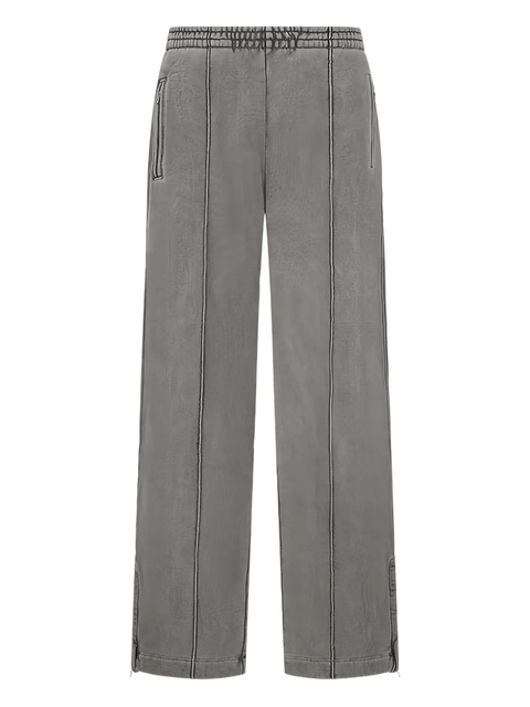 dark grey elasticated waistband side zip pockets centre-seam detailing straight leg ankle zip fastening
