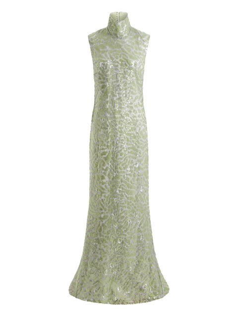 light green sequin embellishment sleeveless high neck open back fishtail hem