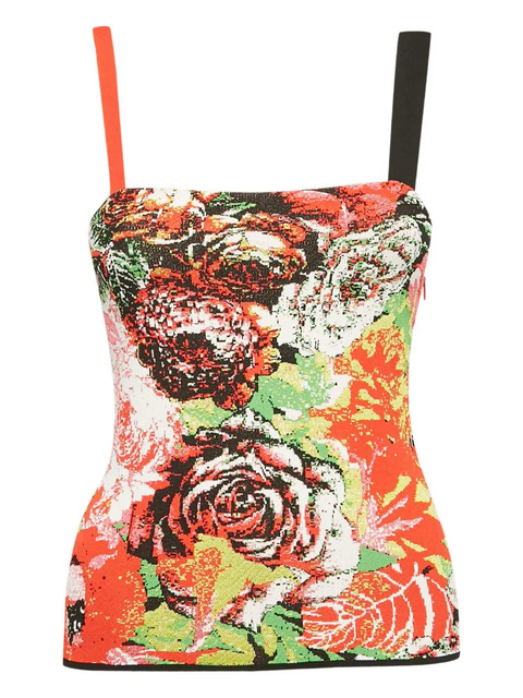black and multicolour floral jacquard knit red straps black straps rose pattern intricate floral tapestry