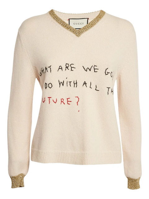 beige lurex detailing neckline cuffs embroidered text long sleeves V-neck