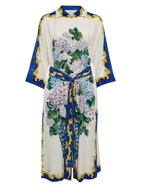 white silk all-over floral print front button fastening tied waist classic collar long sleeves mid-length side slit Condition: GOOD. This previously owned and used item is in good condition with minimal signs of use. This may include fading of material or plating and scratches.