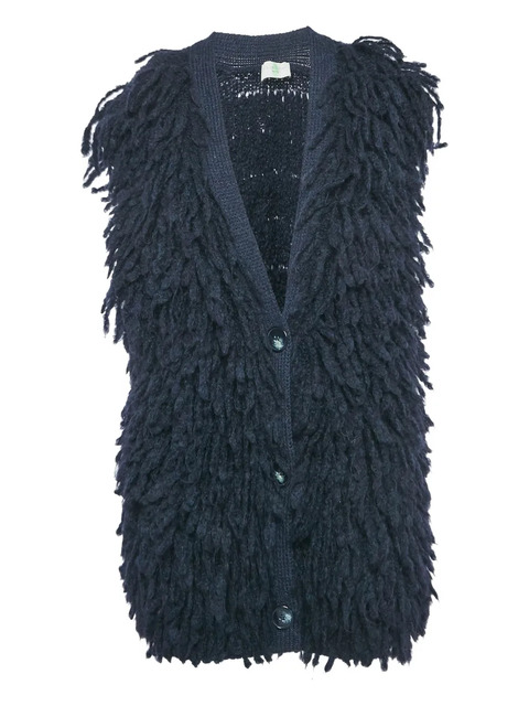 navy blue wool alpaca blend button front closure sleeveless design fringe detailing Condition: GOOD. This previously owned and used item is in good condition with minimal signs of use. This may include fading of material or plating and scratches.