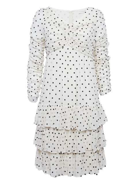 white polka dot pattern tiered ruffle detailing long sleeves gathered bodice Condition: GOOD. This previously owned and used item is in good condition with minimal signs of use. This may include fading of material or plating and scratches.