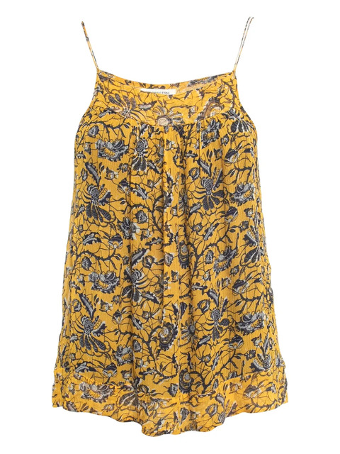 yellow floral print gathered sleeveless design Condition: GOOD. This previously owned and used item is in good condition with minimal signs of use. This may include fading of material or plating and scratches.