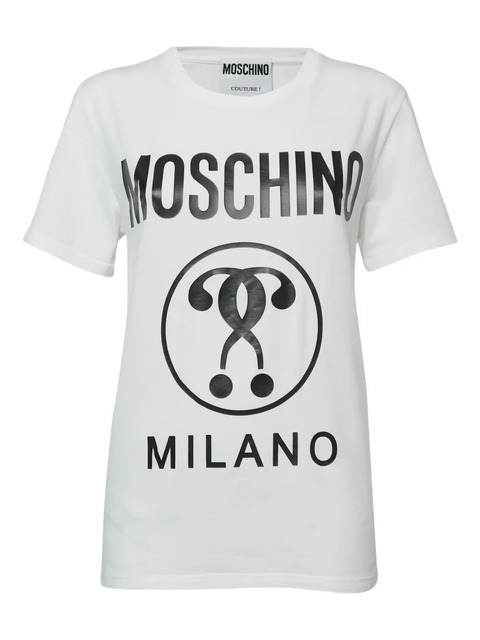 white cotton knit crew neck front branding moschino logo Condition: GOOD. This previously owned and used item is in good condition with minimal signs of use. This may include fading of material or plating and scratches.
