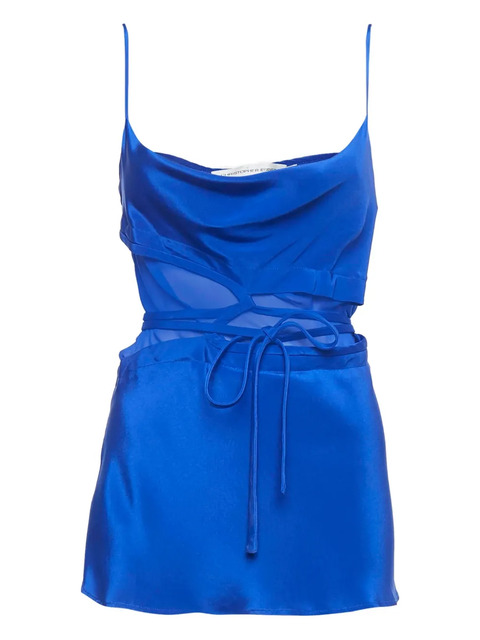 blue silk cowl neck mesh panel tie-up detail delicate straps Condition: EXCELLENT. This previously owned item is in near-perfect condition with no signs of damage or use.