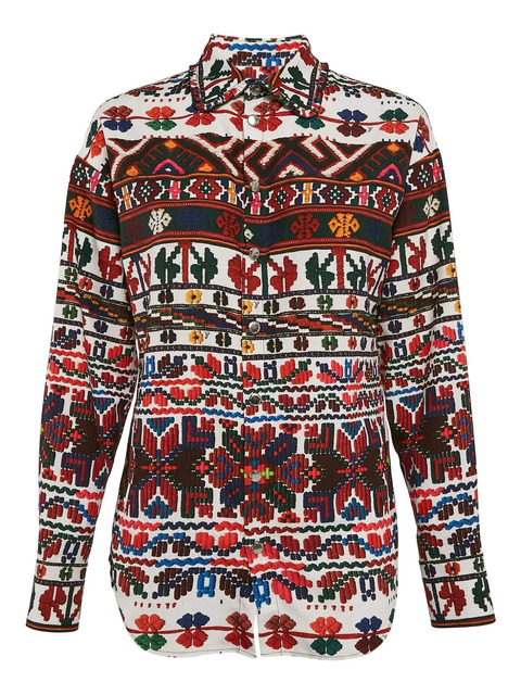 red sateen fabric multicolored printed pattern geometric and floral embroidery buttoned closure long sleeves