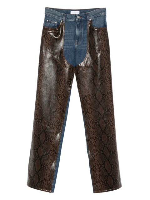 blue snakeskin print panel leather panel button fly