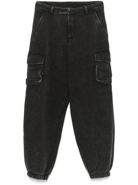 black cotton blend jersey texture washed hook and zip fly fastening belt loops two diagonal pockets to the sides two side cargo pockets elasticated ankles fleece lining tapered leg