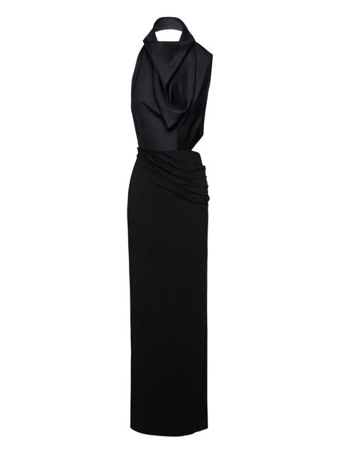 black halterneck design draped bodice side and back cut-out thigh-high slit floor-length skirt
