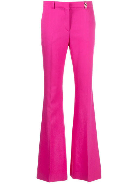 hot pink virgin wool Medusa plaque detail low-rise belt loops hook and zip fly fastening two side slash pockets pressed crease flared hem