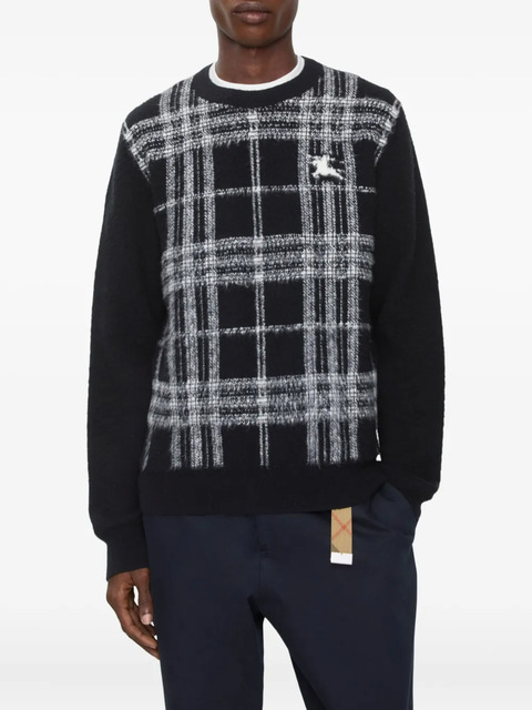 black brushed wool tartan check jacquard knit equestrian-knight detail crew neck