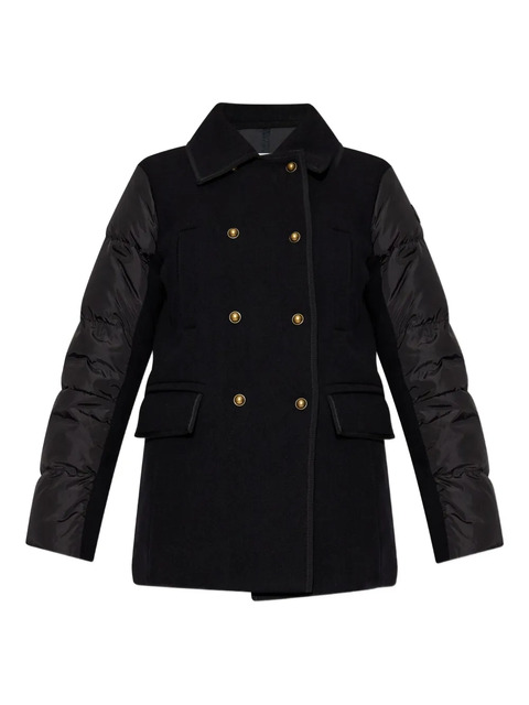 black wool body padded sleeves button fastening flap pockets gold-tone hardware