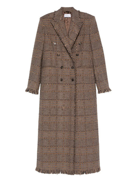brown check pattern crystal embellishments double-breasted fringed edges long sleeves