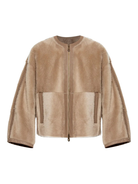 light brown sheepskin zip fastening round neck panelled design long sleeves