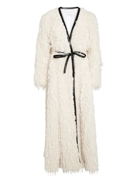 ivory feathery fringe wrap fastening long sleeves self-tie belt A-line