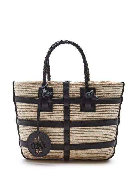 beige/black raffia/calf leather interwoven design two braided shoulder straps perforated logo tag tie-top fastening