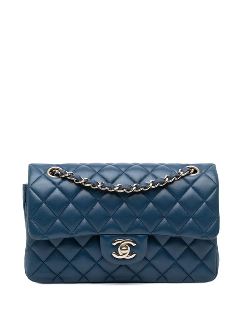 quilted lambskin leather body leather woven chain link shoulder straps double front flaps with interlocking Cs twist-lock closure exterior back slip pocket interior slip pockets blue Serial Number: 25403608 This item has no inclusions. Condition: GOOD. This previously owned and used item is in good condition with minimal signs of use. This may include fading of material or plating and scratches. Please refer to the photos on this product page for a detailed view of the item, including any damages declared.