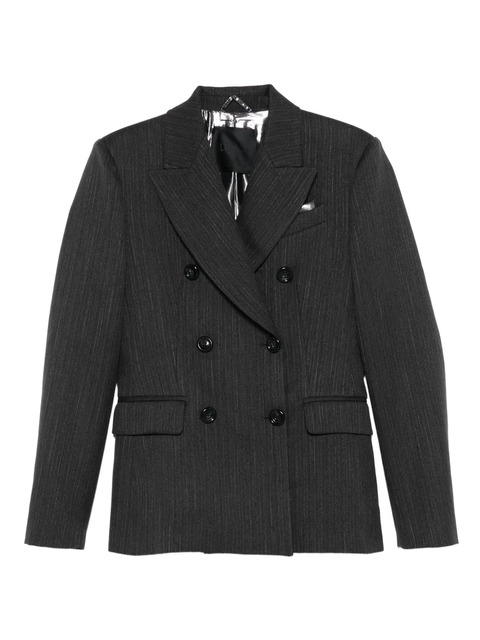 dark grey pinstripe pattern double breasted button fastening peak lapels long sleeve flap pockets