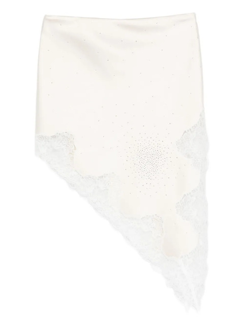 off-white crystal embellishment lace trim asymmetrical hem satin finish