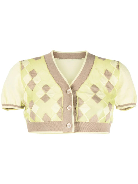 green/multicolour cotton blend knitted construction argyle check pattern front button fastening short sleeves cropped