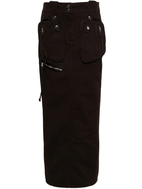 chocolate brown cotton twill weave panelled design satin panels tonal stitching mid-rise decorative press-stud loops two front zip-fastening cargo pockets embroidered tonal logo to the rear rear slit long length logo-engraved silver-tone hardware concealed fly and button fastening