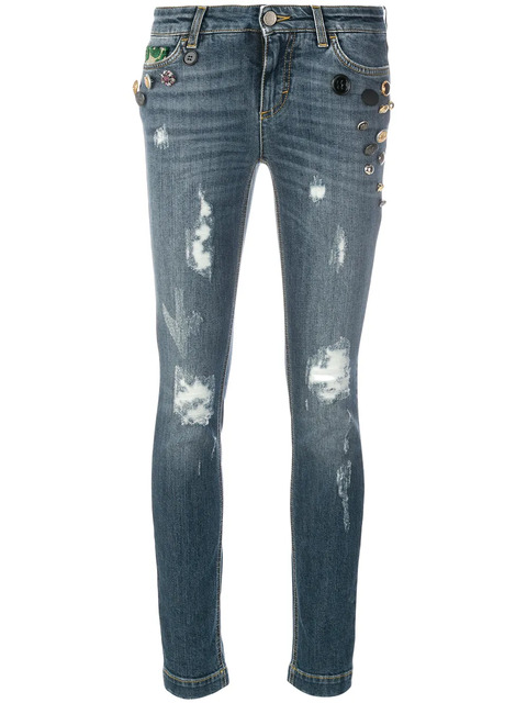 These Dolce & Gabbana distressed jeans are upgraded with decorative button embellishments across the front and back of the jeans and embroidered brocade appliqués to the back pocket and the coin pocket to the front. Crafted from a luxury true blue Italian cotton blend, these jeans also feature a button and zip fly, a waistband with belt loops, a five pocket design, a skinny fit, a cropped length and distressed effects.